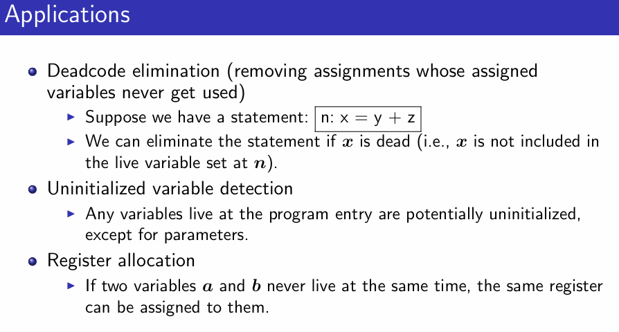 - 초기화되지 않은 변수 탐지: 프로그램 시작점에서 live 변수인데 초기화 되지 않은 변수. 함수 매개변수는 초기화로 간주함.