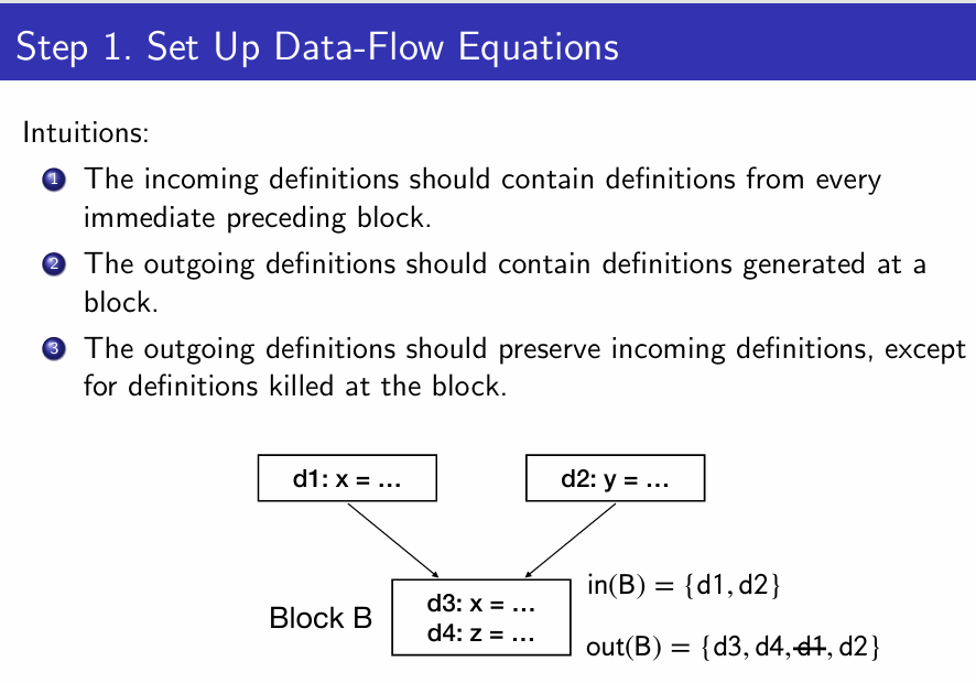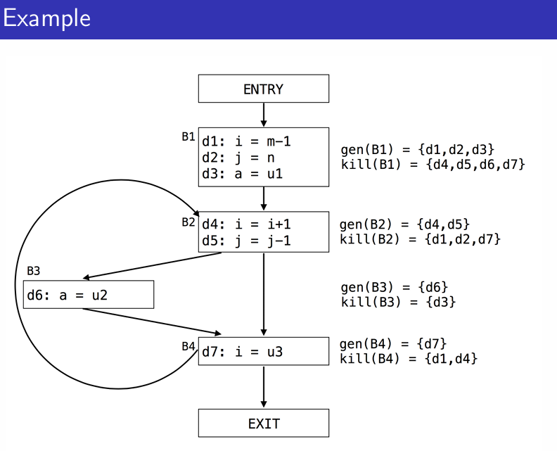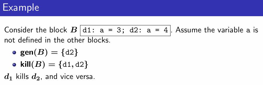 - kill: 블록B에서 제거된 정의. {d1,d2} d1,d2는 서로 같은 변수 a를 정의하며, 한 정의는 다른 정의를 덮어쓴다