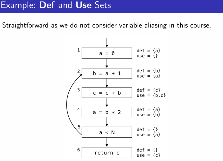 - 인커밍 정의: 바로 앞의 모든 블록에서 들어오는 정의를 포함해야 함. (이전 loop에서 정의된)