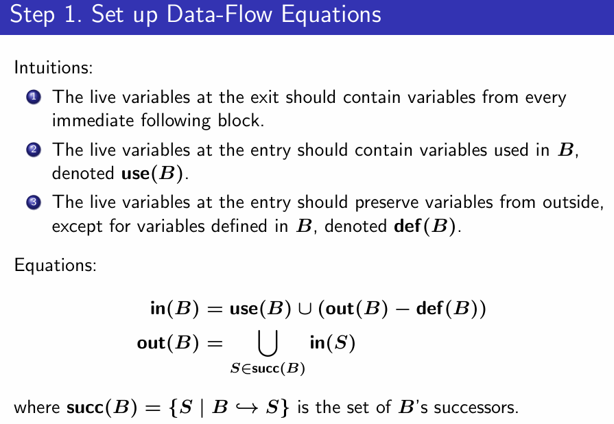 - in B: useB(블록 B에서 사용된 live 변수 집합), outB에서 블록 B에서 정의된 변수 defB를 제외한 변수의 합집합.