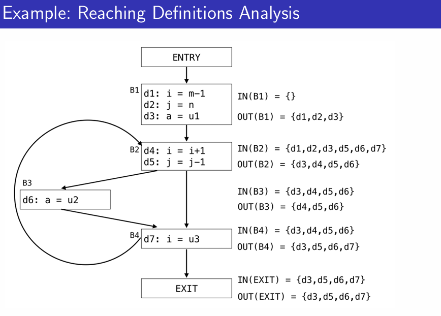 - d reaches: d가 프로그램의 다른 지점 p에 도달하려면 d에서 p로 가는 경로가 있어야 함. d가 경로상에서 killed되지 않아야.