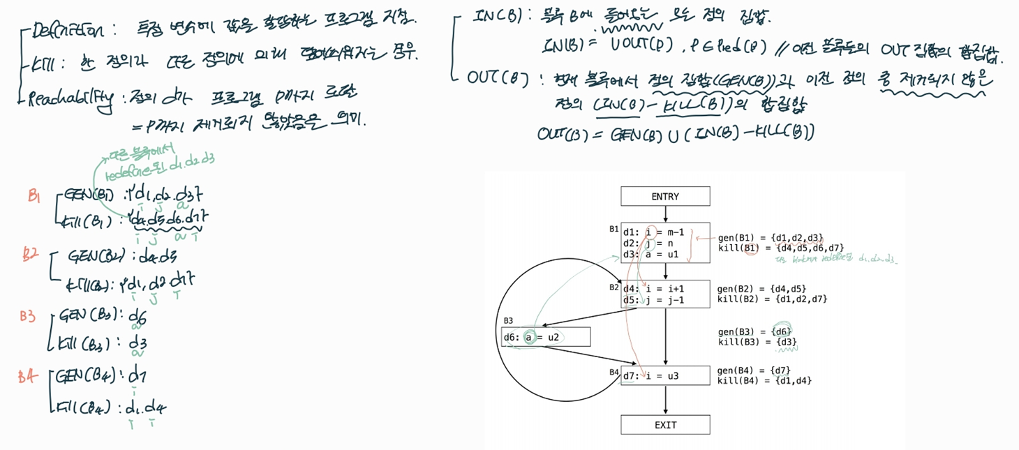 - 블록 Bi 내에서 새롭게 생성된 집합 gen(Bi)를 포함. in(Bi)에서 현재 블록에서 kill된 정의를 제외한 값을 추가함.