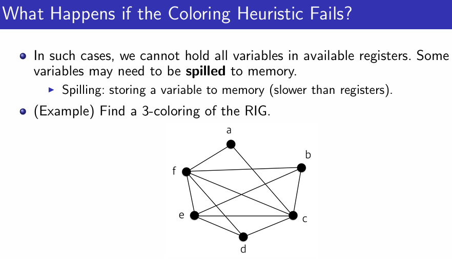 - 추가적인 spill 가능성. coloring 완료 전 추가적인 spill이 필요할 수 있음.
