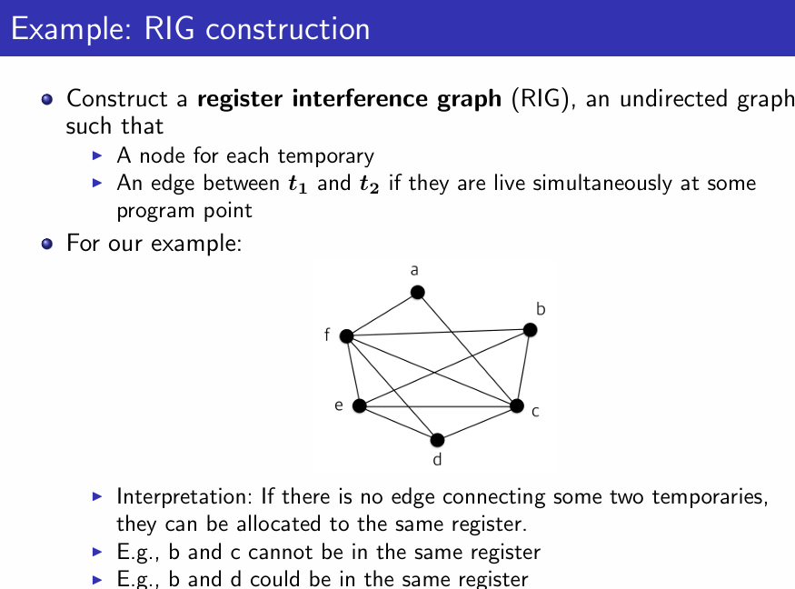 - RIG가 k-colorable이면 k개 이하의 레지스터로 변수를 할당할 수 있음