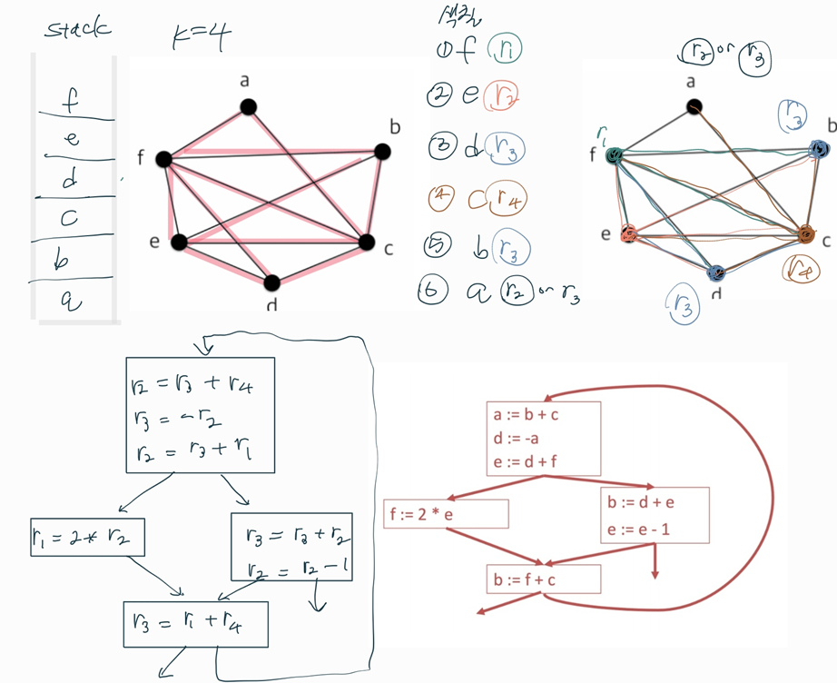 - 3단계: 그래프 색칠을 통해 레지스터 할당. 연결된 노드는 같은 색을 가질 수 없음