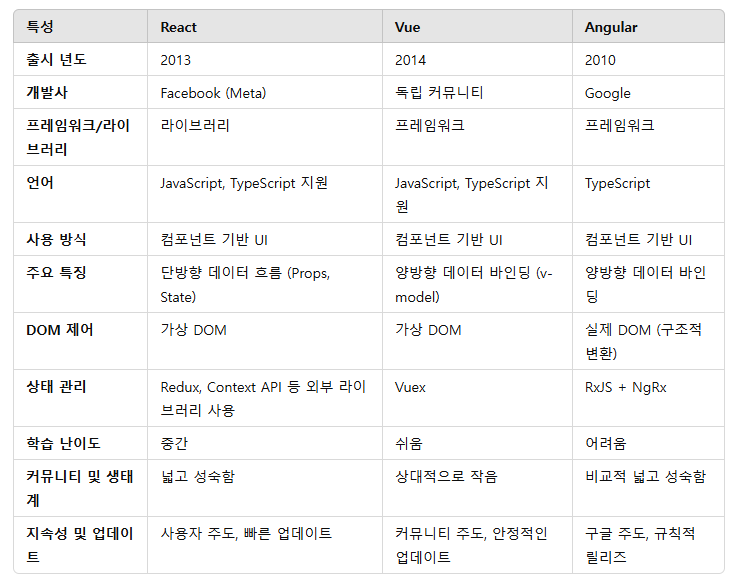 - React: JSX 문법과 단방향 데이터 흐름을 이해해야 함. 기본적인 구조는 간단해서 많은 개발자에게 인기 있음