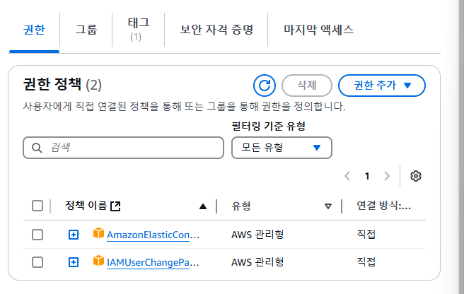 로컬에서 ECR로 이미지를 push하는 권한이 필요하기 때문에 해당 권한 부여