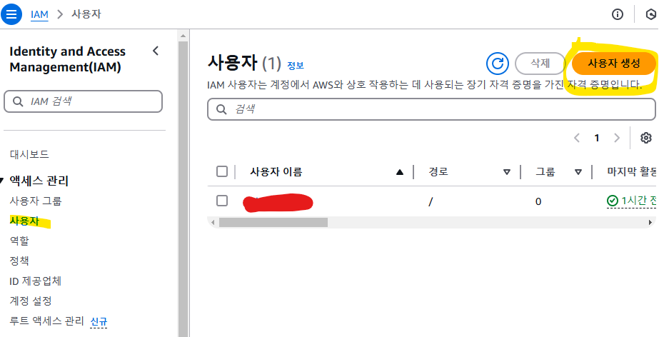 좌측 메뉴 -> 엑세스관리 > 사용자 -> 사용자 생성