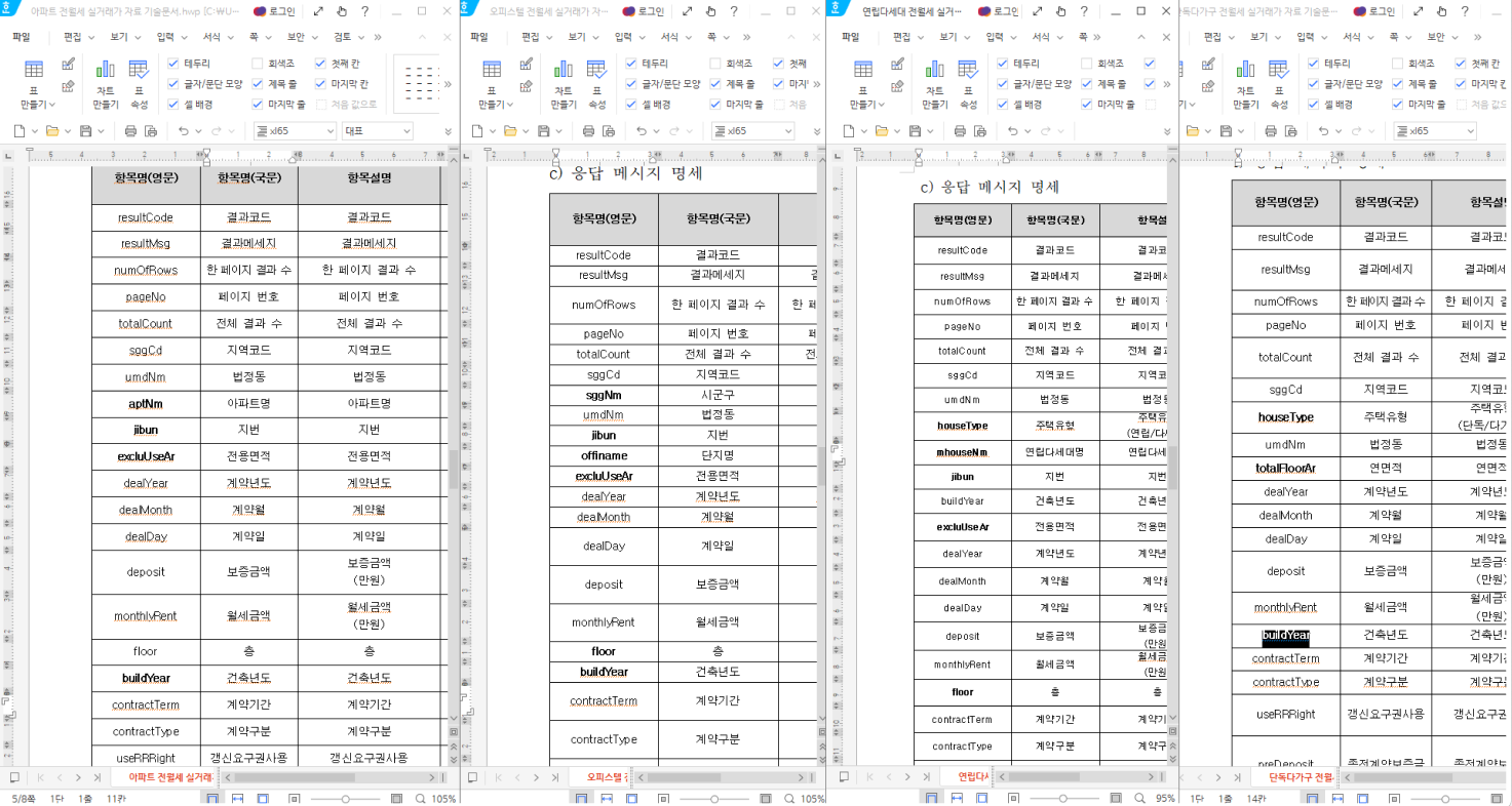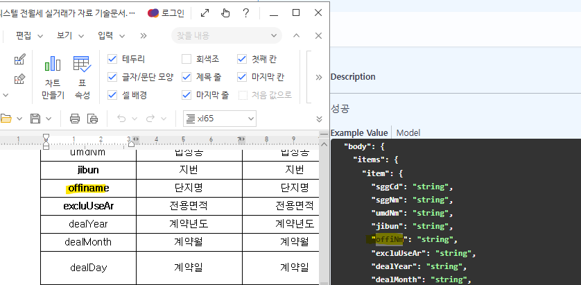 하지만 응답 예상 스키마 속성이 hwp에 써있는 것과 좀 다른 경우가 있습니다