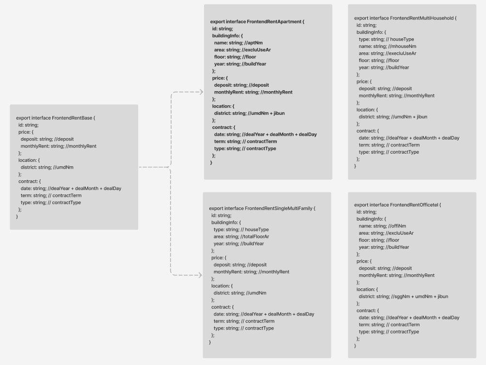 이렇게 공통 interface을 extends해서 각 4개의 BFF API 응답 형태로 가공한다는 걸 도식화?한...