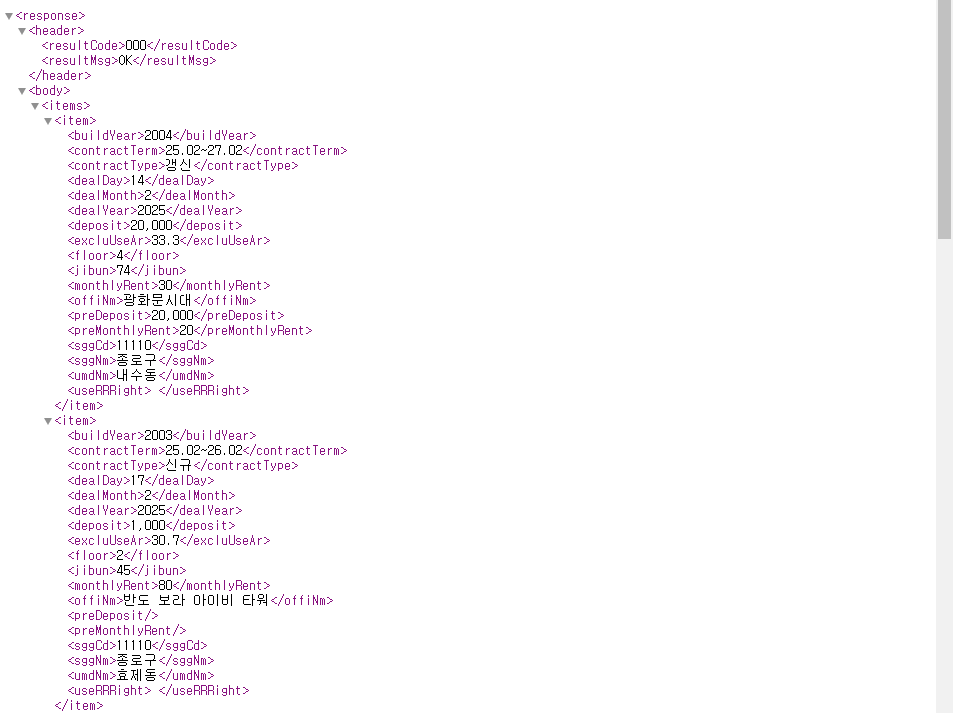 원본 공공데이터 API 응답 구조