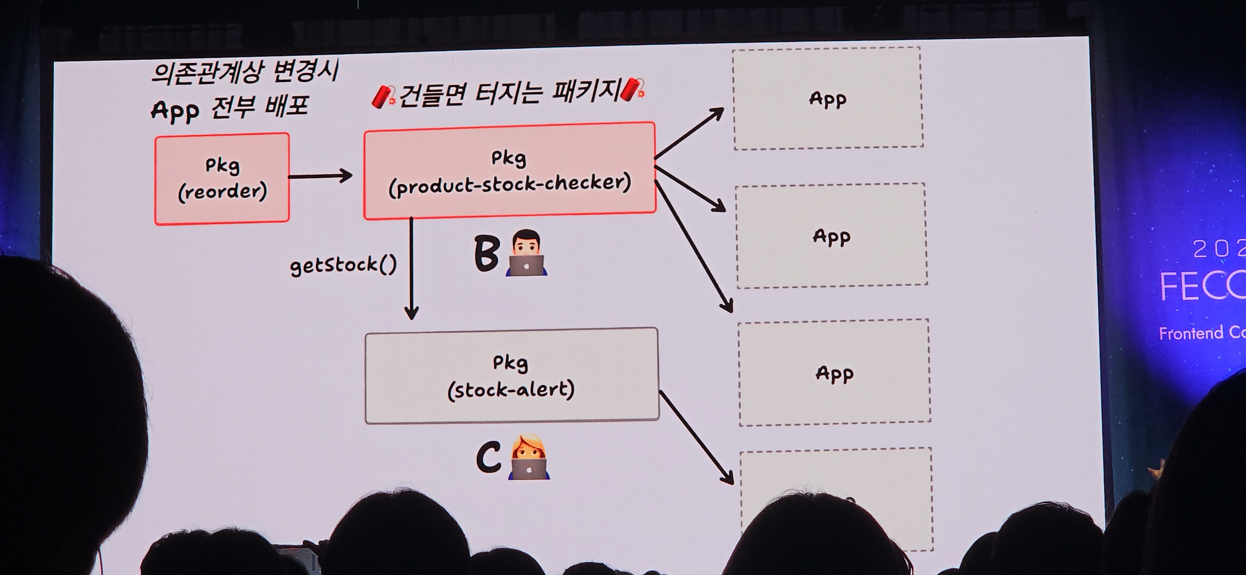 - 이 공용 패키지와 모든 앱들이 터지기 시작한다. (이미 서로의 의존성이 너무 꼬여서 뭘 고치면 뭐가 터질지 모름)
