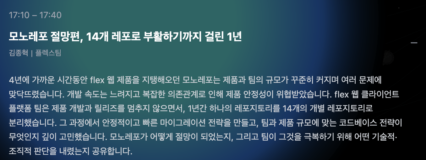 세션7(17:10 ~ 17:40): 모노레포 절망편, 14개 레포로 부활하기까지 걸린 1년