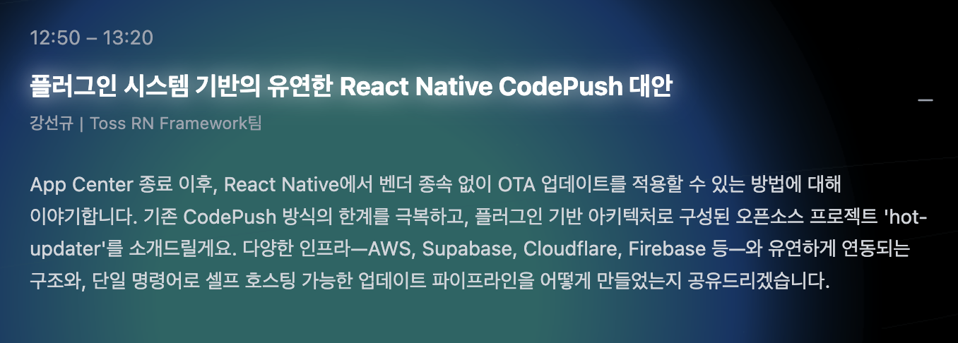 세션2(12:50~13:20): 플러그인 시스템 기반의 유연한 React Native CodePush 대안