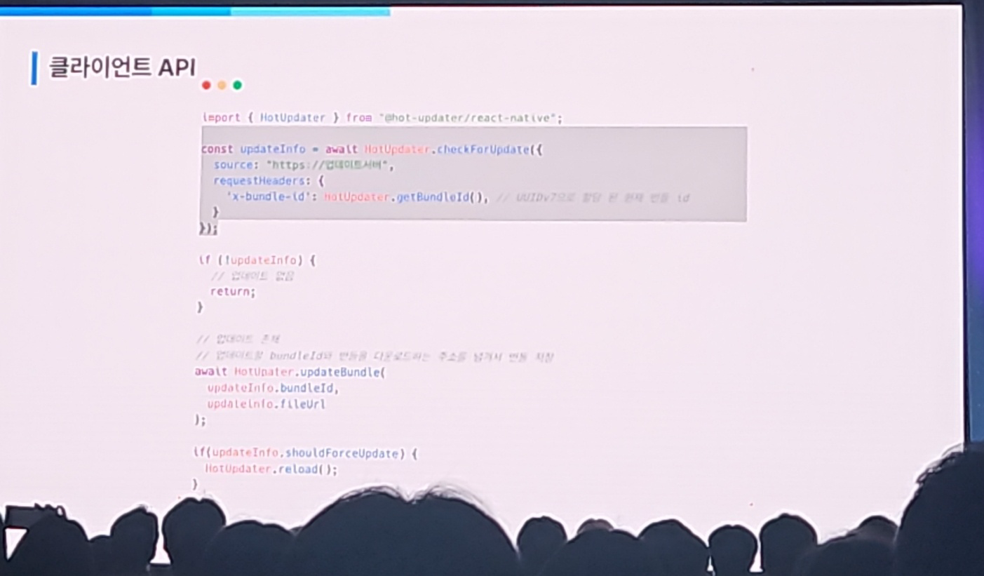 - 앱에서는 HotUpdater.checkForUpdate()로 서버에 업데이트 확인 요청을 함