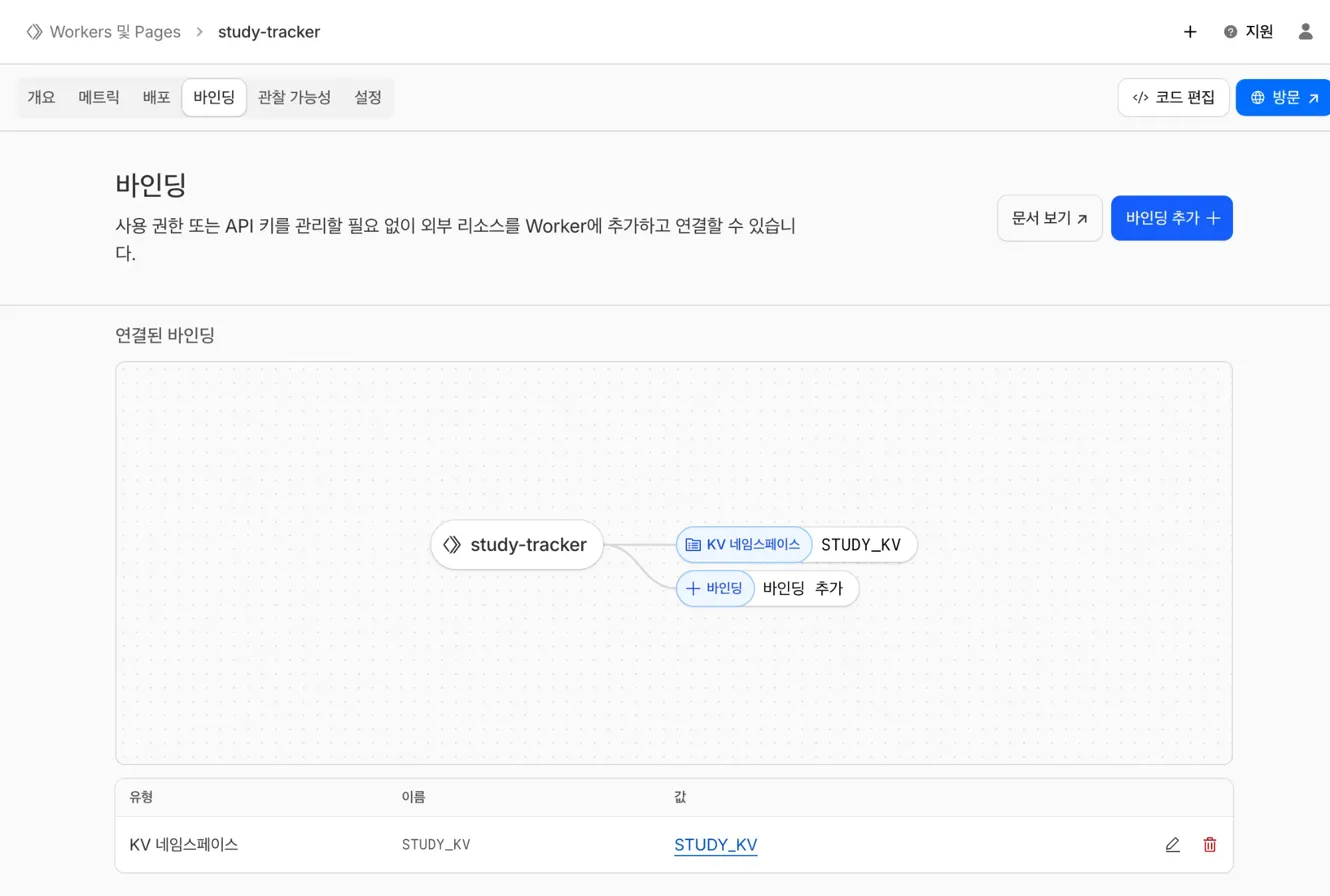 3. Worker 설정에서 KV 바인딩 추가