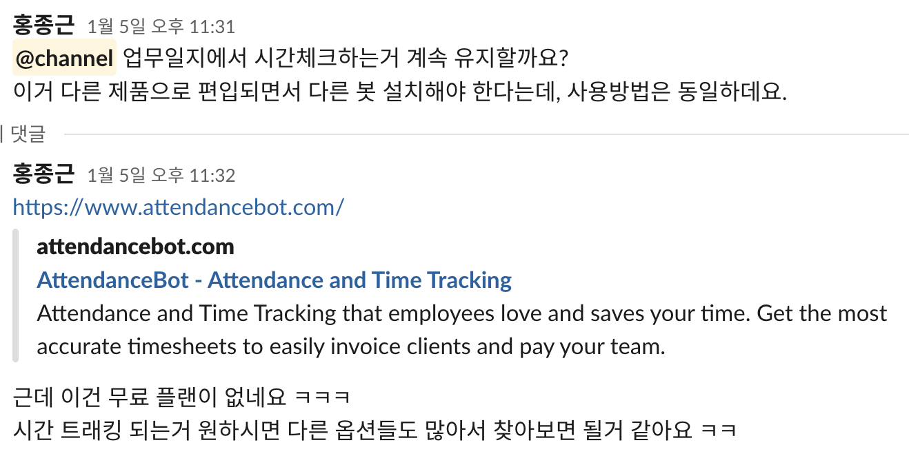 하지만, Clockify는 슬랙 연동이 안됐고,