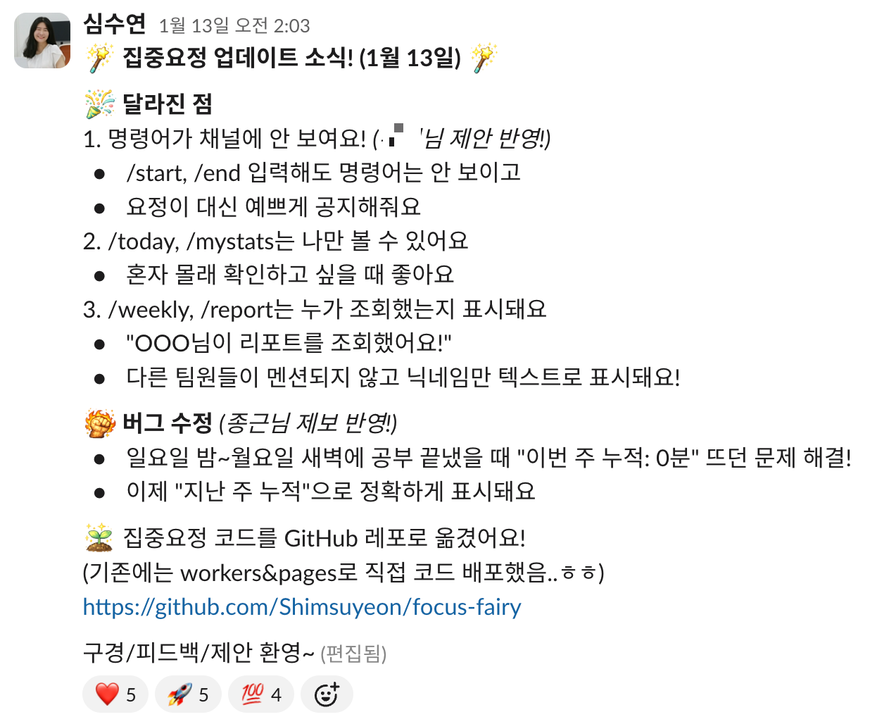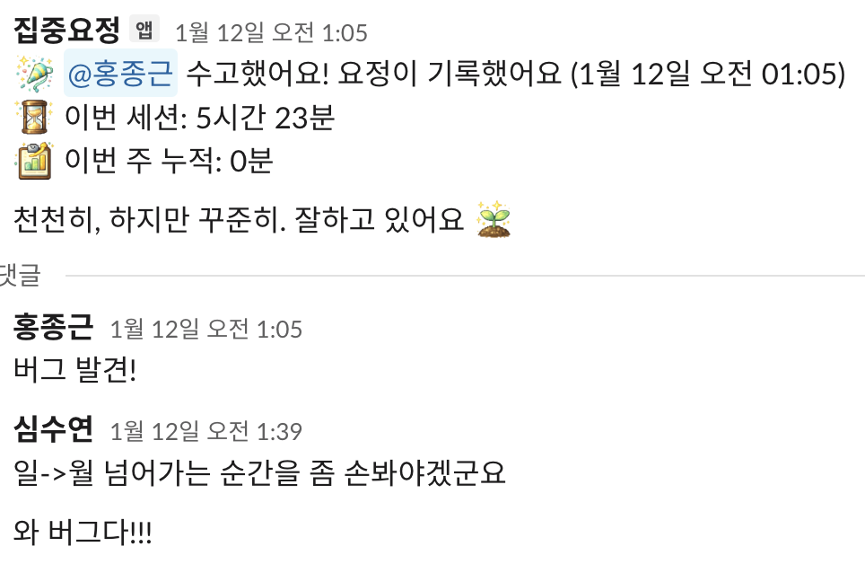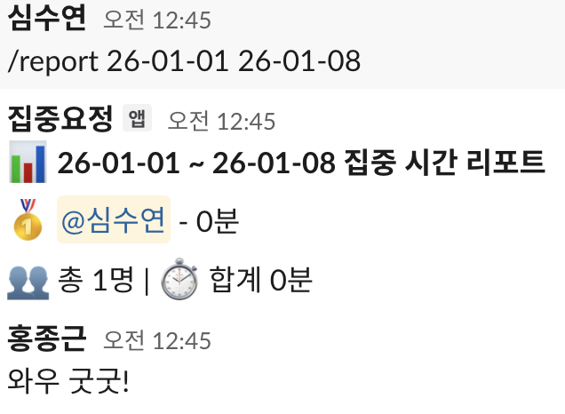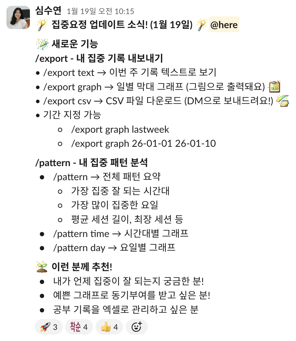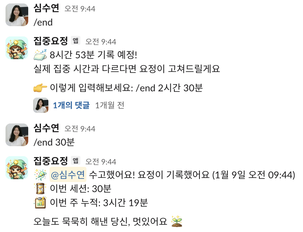'수연님이 찾아오도록 해요'에서 한 마디로 시작된 집중요정 슬랙봇의 현재 모습은 이렇다.