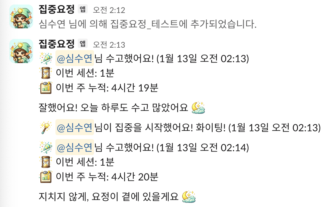 어느정도 완성됐다 싶으면 스터디 슬랙의 비공개 테스트 채널(#집중요정_테스트)에서 테스트를 했다.