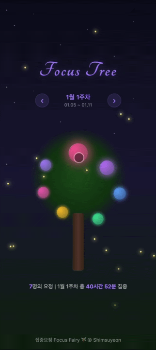 중앙에 나무가 있고 팀원들의 집중 시간이 쌓일수록 열매가 화려해지는 이미지를 떠올렸다.
