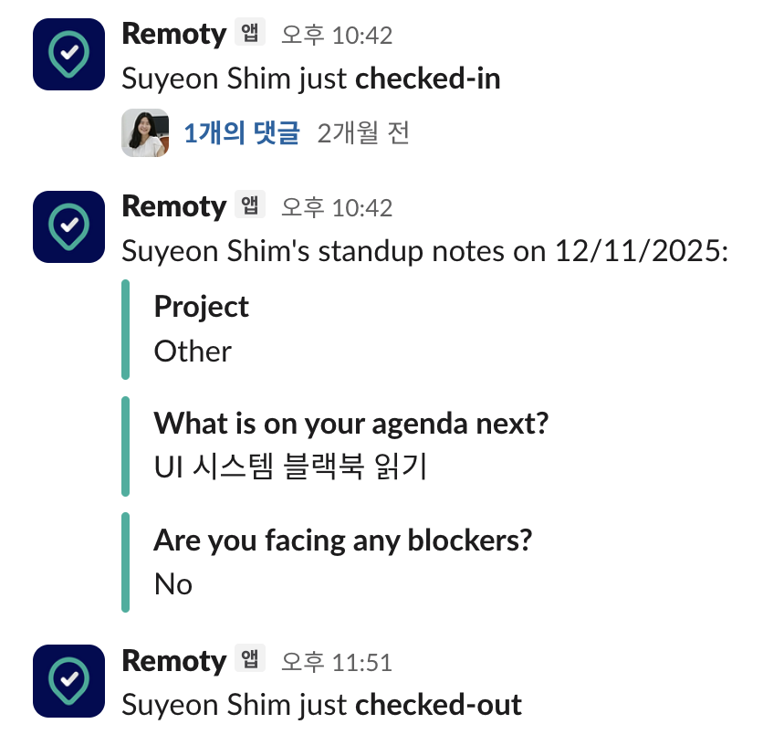 25년 12월 11일, 스터디 슬랙에 시간 기록용 Remoty 봇을 도입했다.