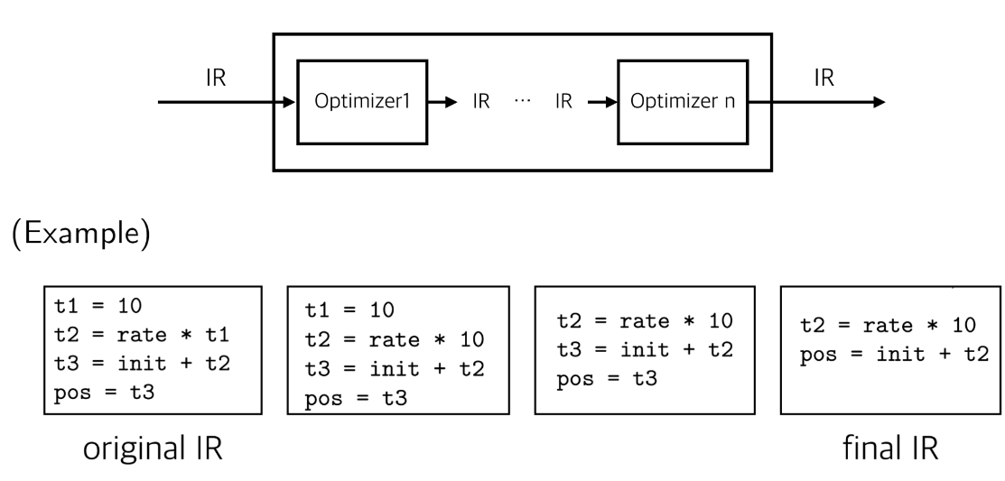 - Middle-end: IR program을 가져와서 efficiency(효율성), energy comsumption(에너지 소비) 측면에서 optimizes(최적화)