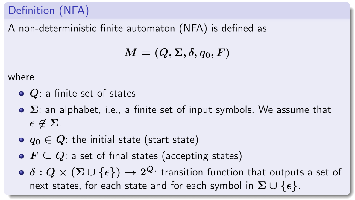 - 2^Q는 상태 집합의 부분집합, NFA가 여러 상태로 전이할 수 있음을 나타냄