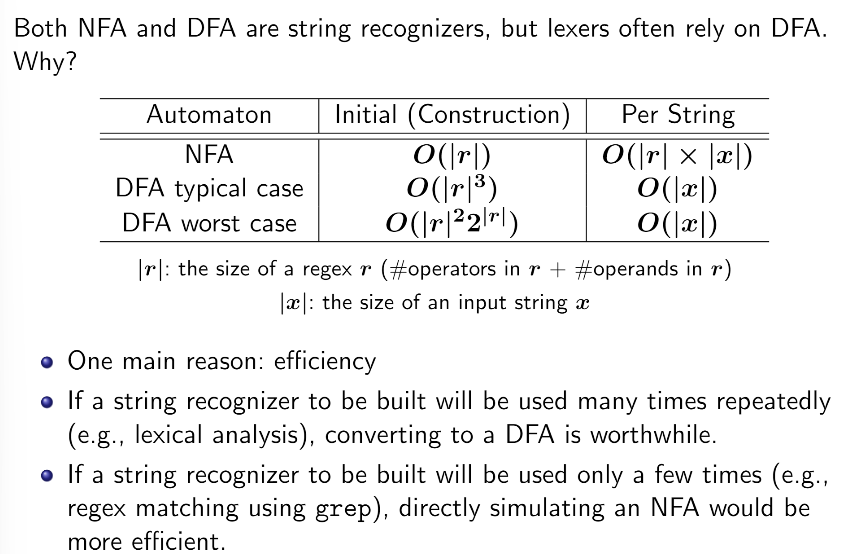 - NFA와 DFA 모두 문자열을 인식하는 도구, 그런데 lexer는 왜 DFA에 의존하는가?