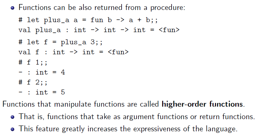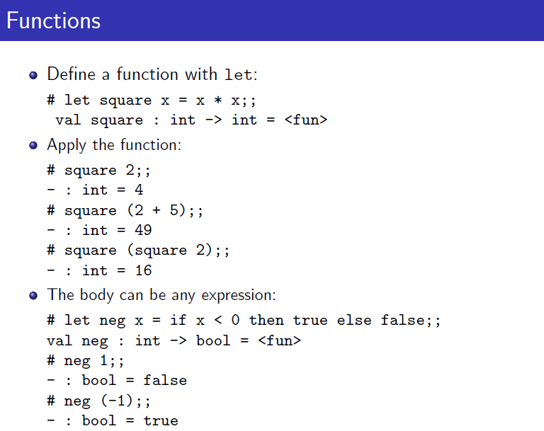 - non-tail-recursive factorial: let rec fact a = if a = 1 then 1 else a * fact (a - 1)