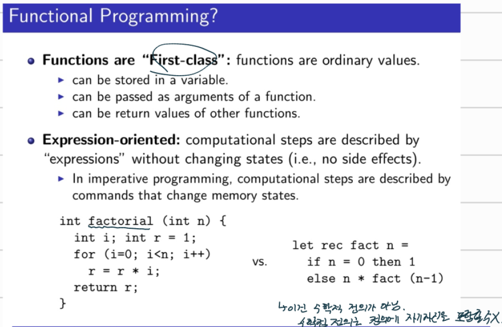 - functional version: 함수형 방식: let rec fact n, 상태를 변경하지 않고 재귀적 호출로 표현식만 계산