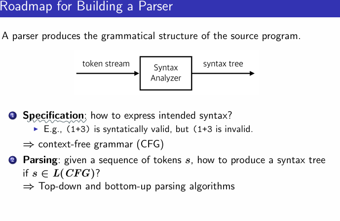 - Parsing: 구문 분석: 주어진 토큰 시퀀스 s에서 s∈L(CFG)인지 확인하고, Syntax tree 생성하는 법