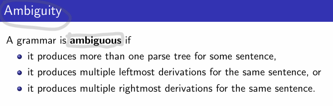 - 같은 문장에 대해 여러 multiple leftmost derivation 또는 multiple rightmost derivation이 유도되는 경우