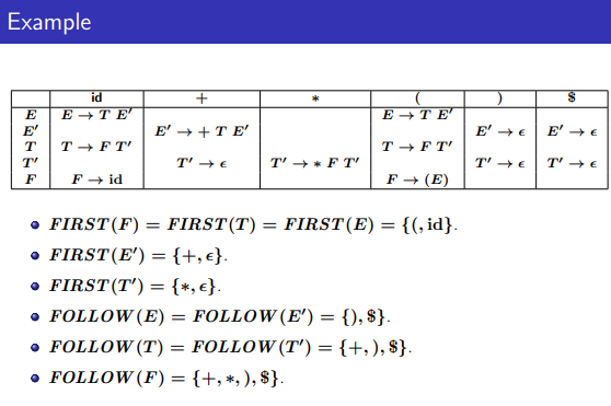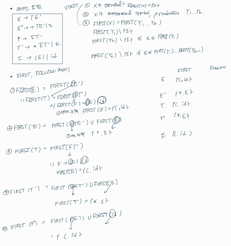 - T가 production 오른쪽에 있는거? E->TE'. FOLLOW(E) 추가 {$,)}