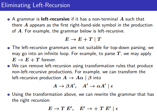 - 하지만 left-recursive는 top-down parsing에서 무한 loop에 빠질 수 있음