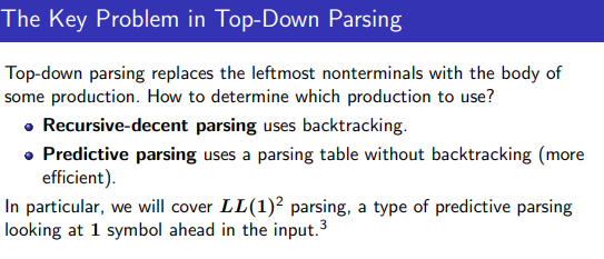 - Recursive-decent parsing: backtracking을 사용해 어떤 production을 선택할지 결정
