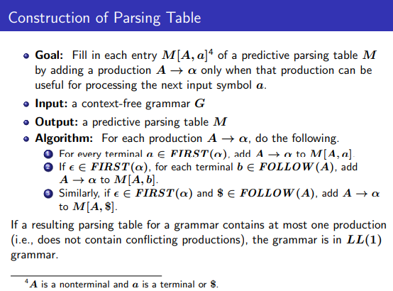 - parsing table의 각 항목 M[A,a]를 채워넣는게 목적임
