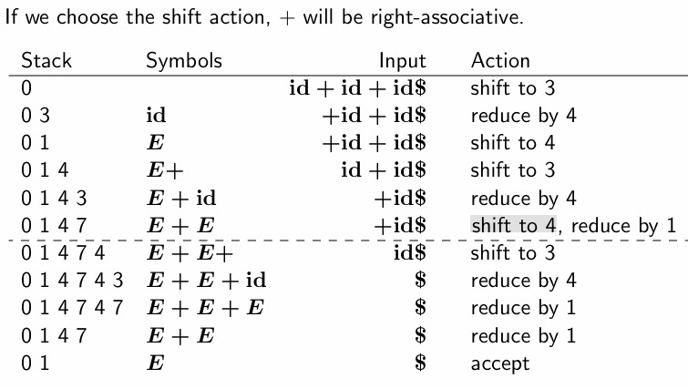 - 연산자 precedence 규칙을 따르지 않는 기본적인 경우에 shfit를 선택해서 해결한다