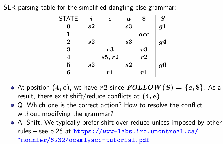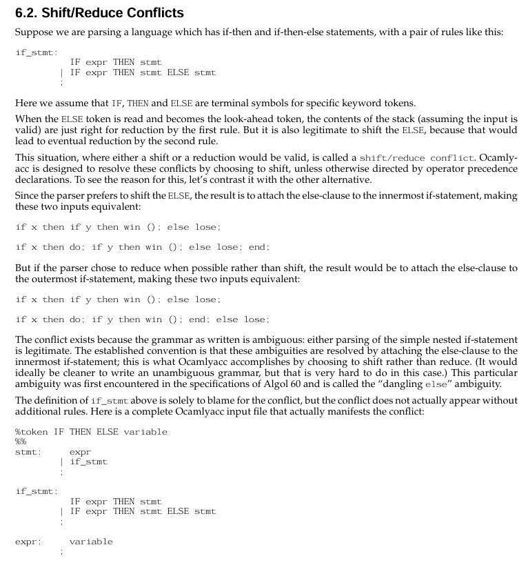- Ocaml yacc(Ocaml parser 생성기) 기본적으로 shift 선택해서 충돌 해결