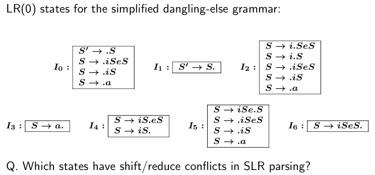 - 4번 state에서 e가 들어왔을 때 reduce(S->iS.)랑 shift(S->iS.eS)가 동시에 발생함.