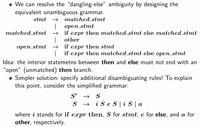 - dangling-else를 해결하기 위해 ambiguous 문법을 unambiguous 하게 바꾸는 방법