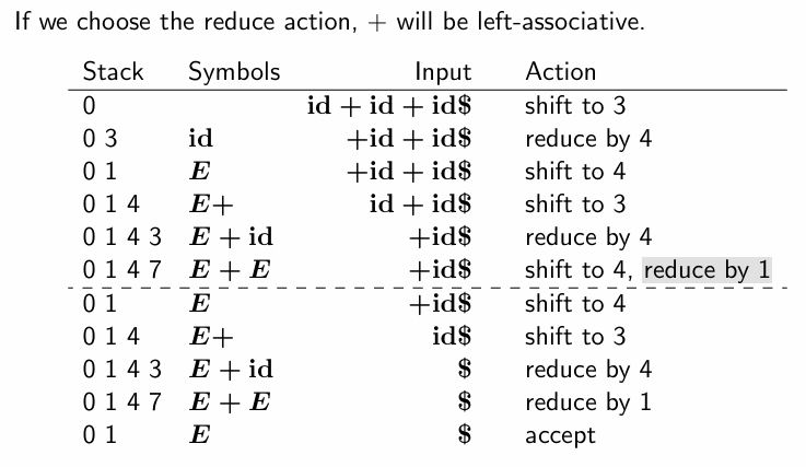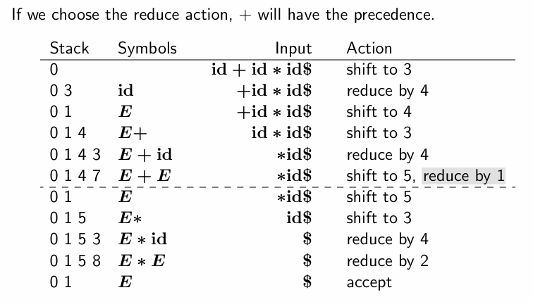 - 여기서 차이점은, shift5일 경우 *가 먼저 처리되며, reduce1일 경우 +가 먼저 처리된다.