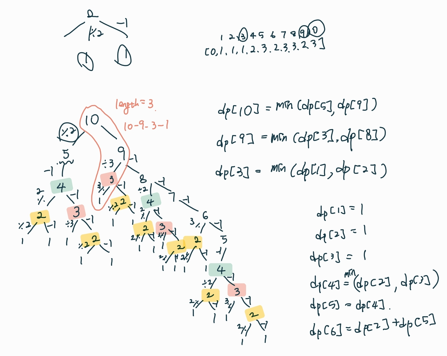 이렇게 하면 dp 배열을 구할 수 있고, dp[n]을 출력하면 n에서 1로 가기 위한 최소 횟수를 알 수 있다