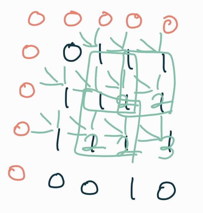 왼, 왼위, 위 원소 세 값이 2인 경우에는, 각 지점에서 모두 변 2만큼 확장할 수 있다는 뜻이고