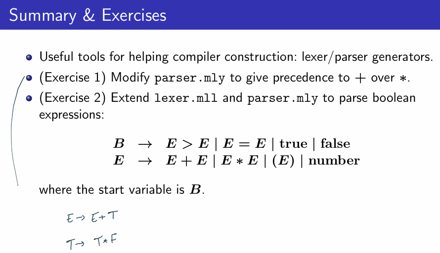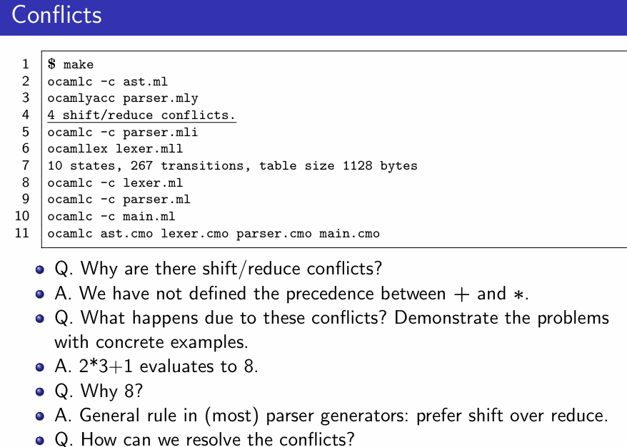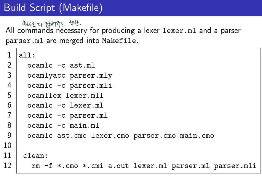 - lexer, parser 수동으로 안만들어도 됨. ocamllex, ocamlyacc로 자동화 가능