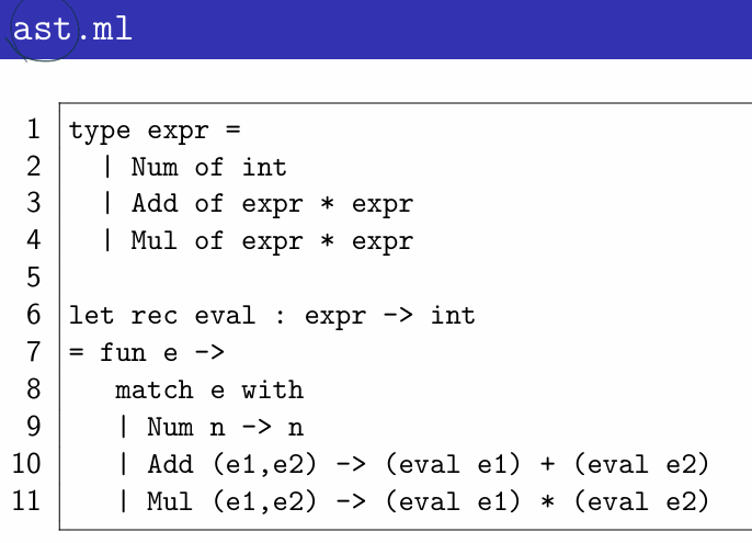 - Mul (Num 3, Add (Num 1, Num 2)) → (eval (Num 3)) * (eval (Add (Num 1, Num 2))) → 3 * 3 → 9