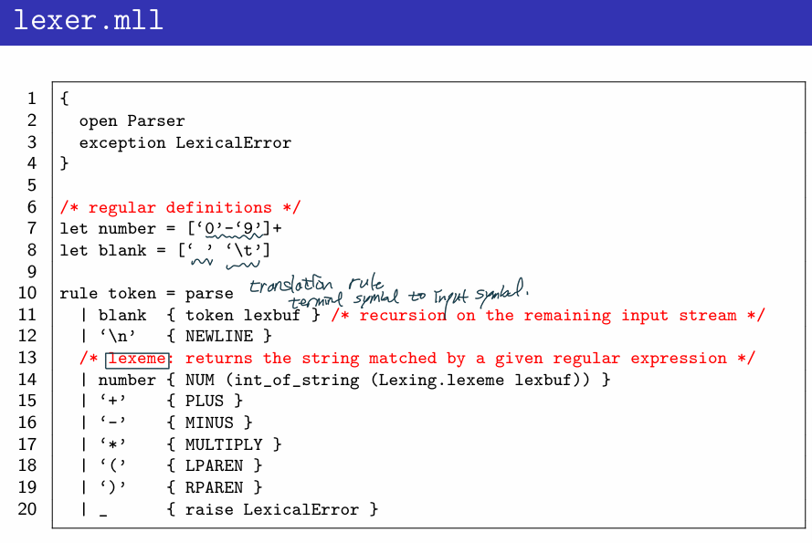 - lexer generator: 어휘 분석기 생성기, ocamllex 사용