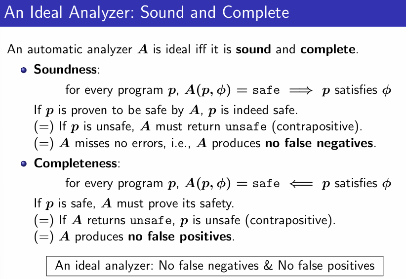 - p가 실제로 안전하다면, 분석기는 반드시 p의 안전성을 증명해야 하낟