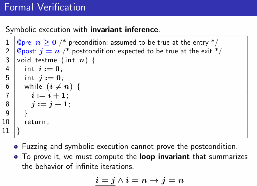 - fuzzing과 symbolic execution은 postcondition을 증명할 수 없다