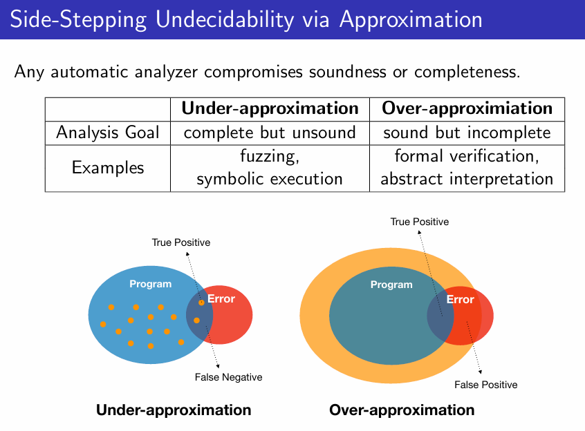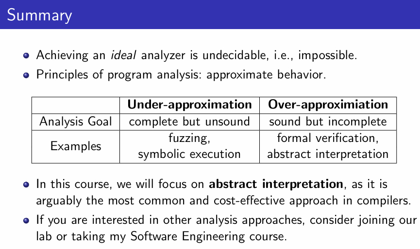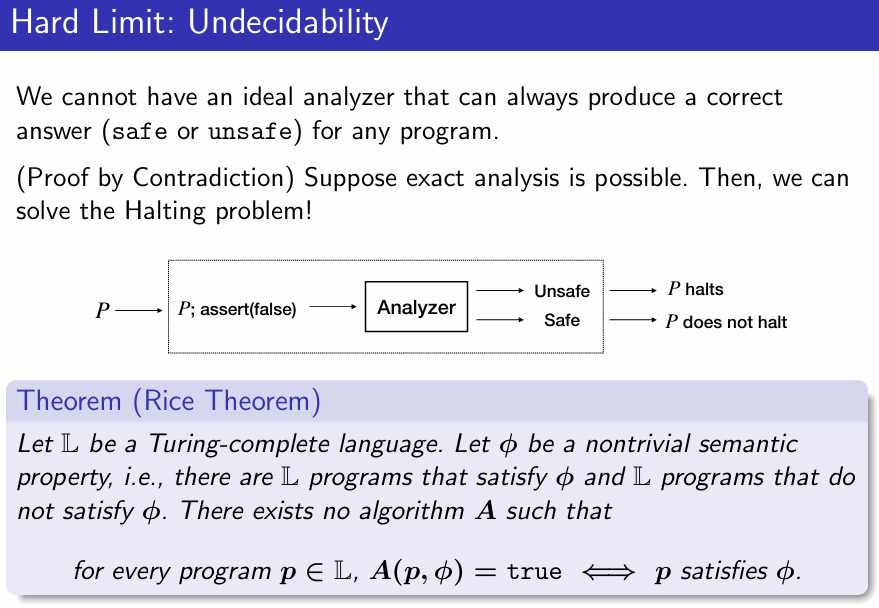 - halting problem은 이미 증명된 결정 불가능 문제이므로, 이를 해결하는 분석기를 만들 수 없음