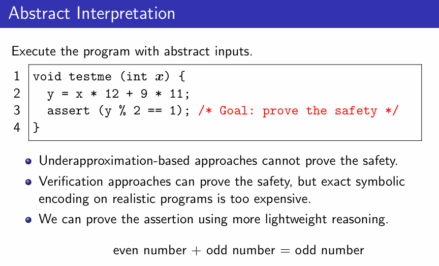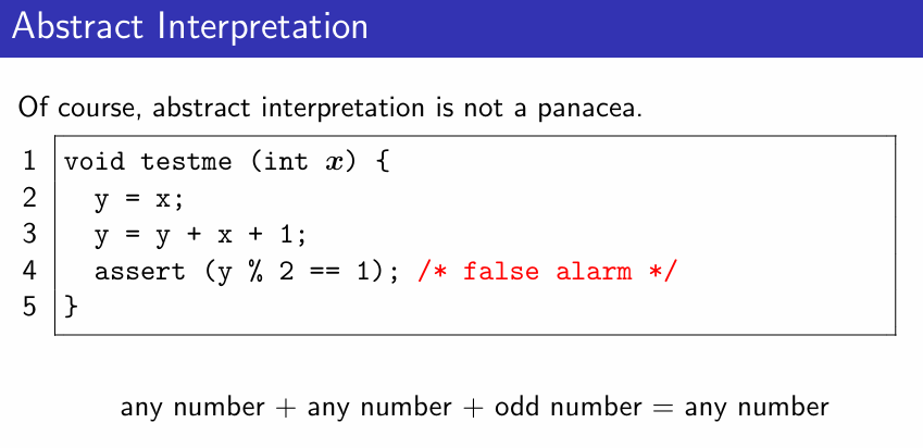 - 수학적으로 2x+1은 홀수라서 참을 보장하지만, 추상적 해석은 이를 보장할 수 없기 때문에 경고를 발생시킴